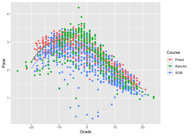 People with a statistics background may be noticing that this is an additive correction for the course rather than a multiplicative correction. I’m honestly not sure which would be better, but this is easier to set up so I’m using it[4] Here’s the result with the two courses we’ve seen already plus another long run of 20 miles or so. This gives us about the result we’d expect: the two workouts, Priest Rock and Rancho are about the same length and so the curves nearly overlap, with no significant difference in the coefficient for Rancho; the only real difference in pacing is that Priest was somewhat hillier than Rancho. By contrast, because SOB is a much longer event, it’s notably slower even at the same grades. This result should give us some confidence that this modelling strategy isn’t too terribly wrong.[5]
