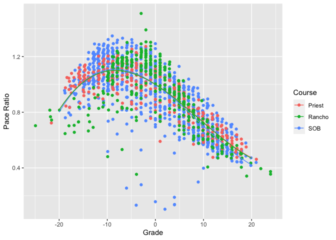 This gives us the correction factor we need to predict pace at any grade for any course. Here’s the same graph with Pace Ratio on the y axis rather than Pace. As you can see, this looks pretty good, with both the data points and the fits nicely overlaid. You’ll also note that fits aren’t precisely identical. This is because the correction factor for course is additive rather than multiplicative, and so when mapped onto a ratio you don’t get identical ratios for each curve. However, it’s quite close, and given the inherent uncertainty in this data, it’s probably close enough.