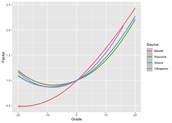 As I noted at the beginning, there has been other work in this area, though perhaps not as much as you’d think. Many endurance training sites such as Strava, Garmin, and Runalyze have what’s called Grade Adjusted Pace, which attempts to map actual pace onto the notional pace that the same effort would have produced on level ground. I don’t know what Garmin’s algorithm is, but the Runalyze algorithm and the original Strava algorithm seem to trace back to a paper by Minetti et al. called “Energy cost of walking and running at extreme uphill and downhill slopes”.