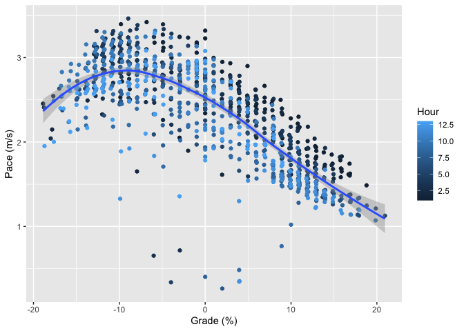 I’ve also colored the segments by how far into the race I was (which hour). As you can see, I’m slowing down slightly as I get further into the race, especially on the uphills. This is probably due to my decision to run the climbs at the beginning and hike later. There’s no obvious equivalent pattern at grades <0%, which suggests that I’m not slowing down much when I choose to run, a sign of good, even, pacing. There are a number of real outliers here with very slow pace. This is probably due to three things: (1) time spent in aid stations which I was too lazy to remove (2) times when I had to go through so some really technical section (3) GPS error.