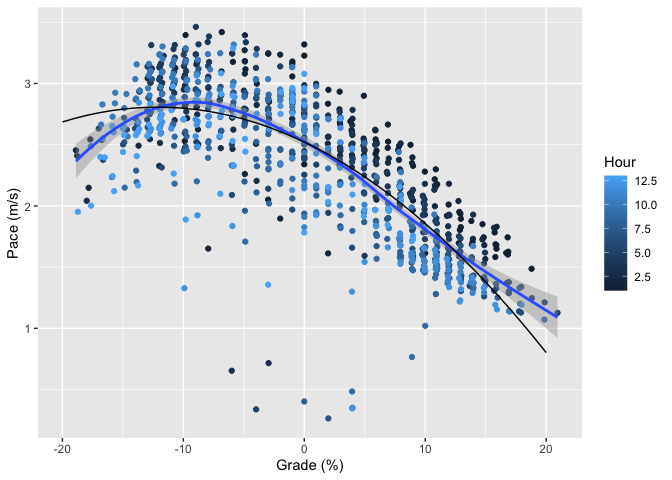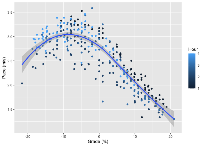 I’ve added two extra pieces of decoration here. First, the blue line is a loess smoother applied to the points. This is just ggplot’s default smoother and gives us kind of an eyeball fit that helps us see the pattern that’s obvious from the points anyway: generally, climbing is slower and descending is faster, but once the hill gets really steep (above 10%) then descending starts to get slower again. The reason for this is that gravity wants to take you down faster than you (or at least I) can (safely) run, so you’re actually trying to slow down. This is a common pattern, though of course some people are better descenders than others.[3]