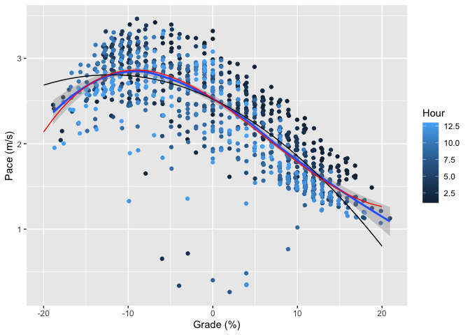 My initial reaction here was to be sad because a third-degree polynomial is clearly aphysical: we know that pace is slower at very steep uphill and downhill grades, and any odd-degree polynomial has to point in opposite directions at positive and negative infinity (you can see the start of this in the flattening of the third-degree curve around +20%). However, if you take a step back, any polynomial fit is clearly aphysical because grades with absolute values over 100% don’t make any sense: they’re just steep in the other direction. Moreover, once you get close to 100% in either direction, you’re not really talking about running any more, but rock climbing, and the dominant factor starts to be the quality of the surface, not the grade. As a practical matter then, we’re looking at a function that’s only defined in a relatively narrow domain of grades. Finally, what we’re trying to do is really just summarize the data for the purpose of comparison and prediction, and for that it doesn’t matter that much whether we have a good physical model, so long as it does a good job of matching the data and has a small number of coefficients to minimize the risk of overfitting.