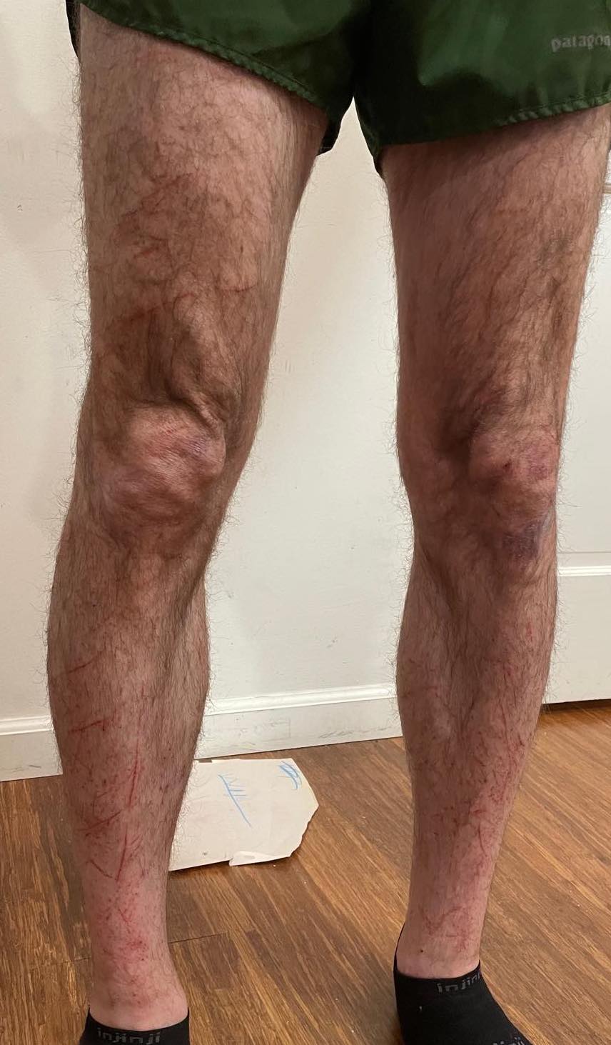 The rest of our equipment choices seemed pretty reasonable. We decided not to bring poles and they would have mostly been in the way. I was right at the limit of my Salomon Advanced Skin Set 5 (in fact, it's now tearing out at a seam) but it did OK. I made a last minute decision to wear my Salomon Ultra 3s instead of my Sense 4 Pro because they're a bit more stable. I think that was a mistake because I like a slightly more precise shoe for this terrain--on the other hand, Chris did it in Ultra Glides so probably not a big deal; also my socks started to slide down and the collar of the Ultra 3s tends to rub a bit. I don't much like calf sleeves, but I sort of regret not wearing them in this case. That way my legs wouldn't have looked like this: