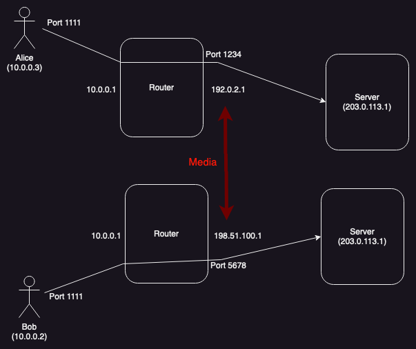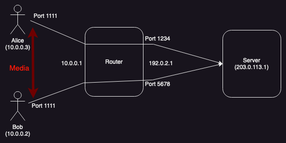What you want is for the media to take different paths (shown in red) depending on the topology: if Alice and Bob are not [corrected, 2023-07-02] on the same network, the media should flow between the server reflexive addresses (on the outside of the NAT) and if they are on the same network it should flow between the host addresses (on the local network interfaces). The problem is determining which of these address pairs to use, because it's not practical to determine which scenario you are in.[1] If neither address is guaranteed to work, the only option is for each side to send both addresses. In this case, Alice would send Bob two addresses (ICE calls these "candidates"):
