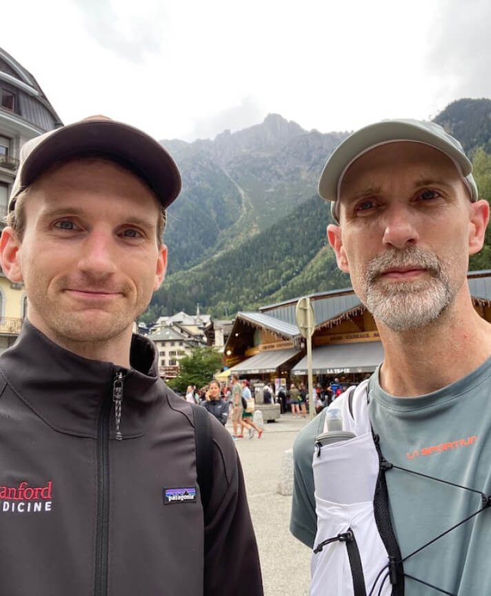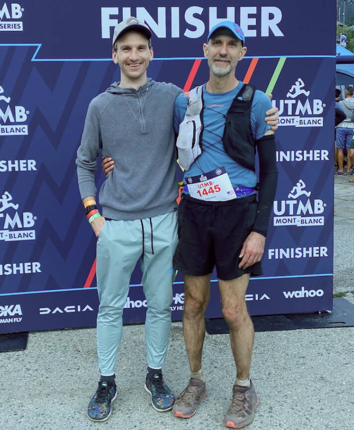 Next, there's crewing but no pacing. Most US hundreds will allow you to have someone run the latter part of the race with you; for instance, I'm pacing my friend and training partner Chris at Stagecoach 100 in a few weeks. UTMB doesn't allow pacing outside of short zones near the aid stations—and somewhat informally in the last 200 meters of the race or so—though, as I said above, you're never really alone anyway. It does, however, allow a single crew member, which is super-helpful, and Chris came over to crew me.